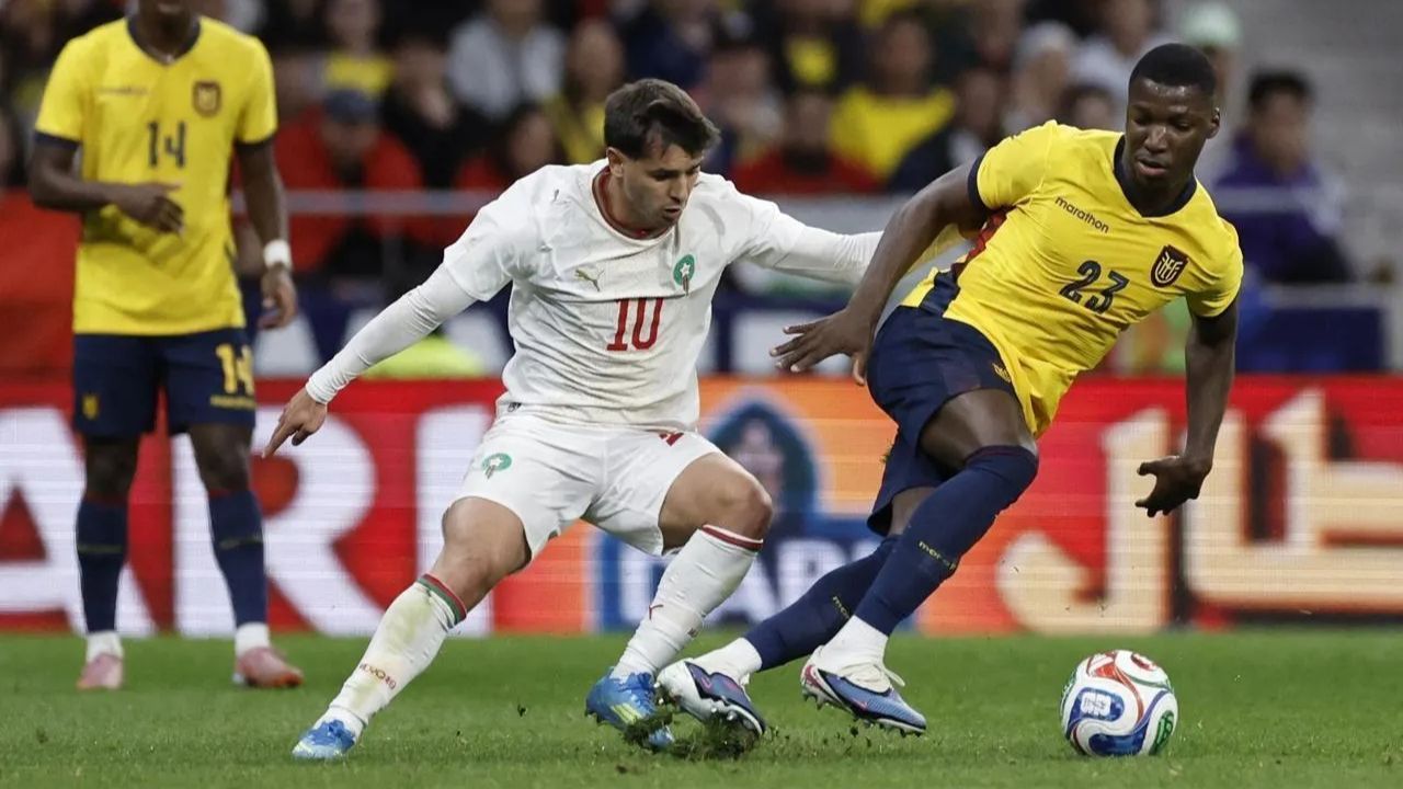 Le Maroc a connu une entame difficile. Moisés Caicedo a fait trembler le poteau dès la 16e minute. Yassine Bounou a dû s’employer à plusieurs reprises pour maintenir les siens à flot. Le bloc marocain, organisé en 4-2-3-1, a peiné à trouver ses repères face à la discipline tactique de la Tri.